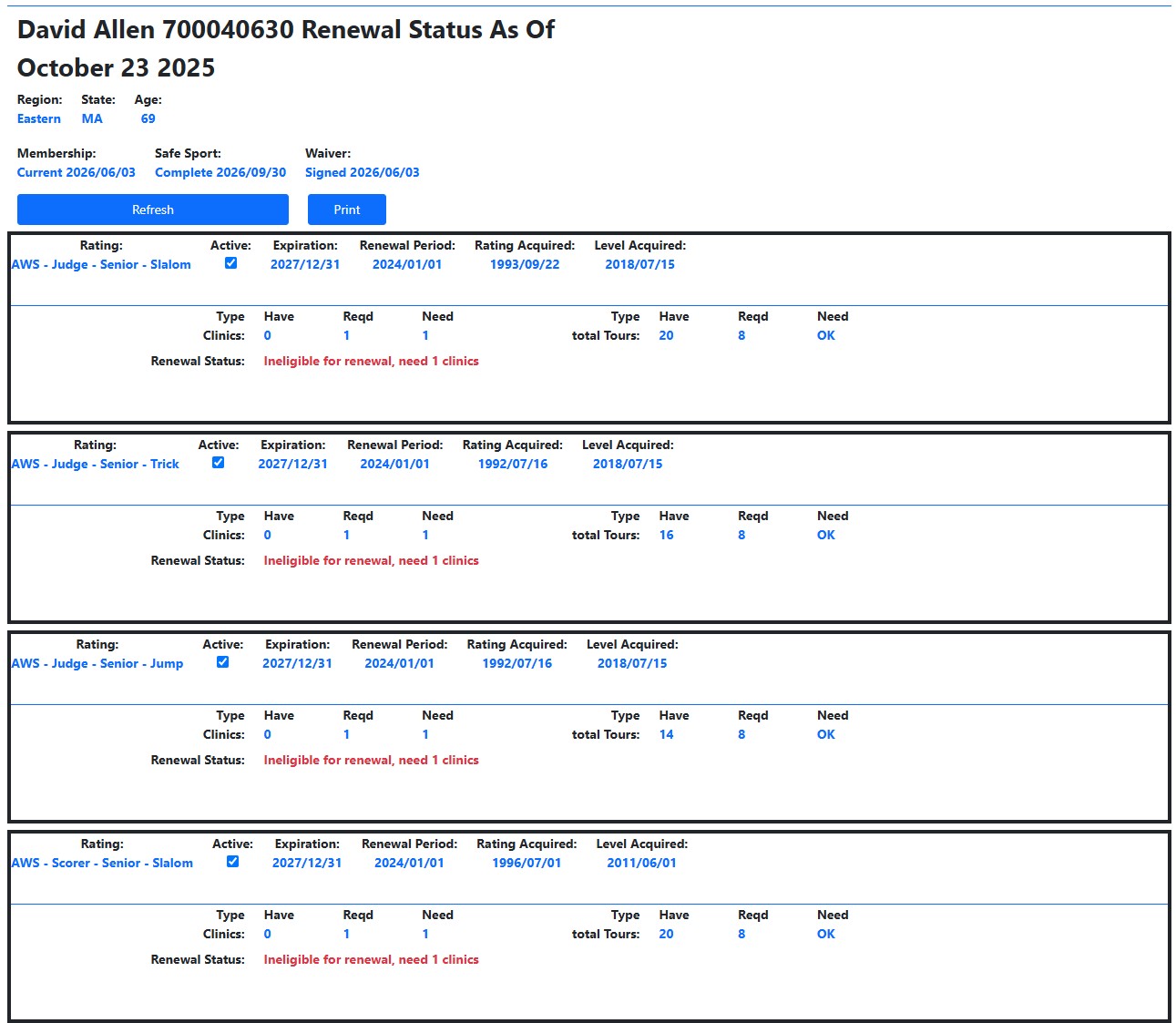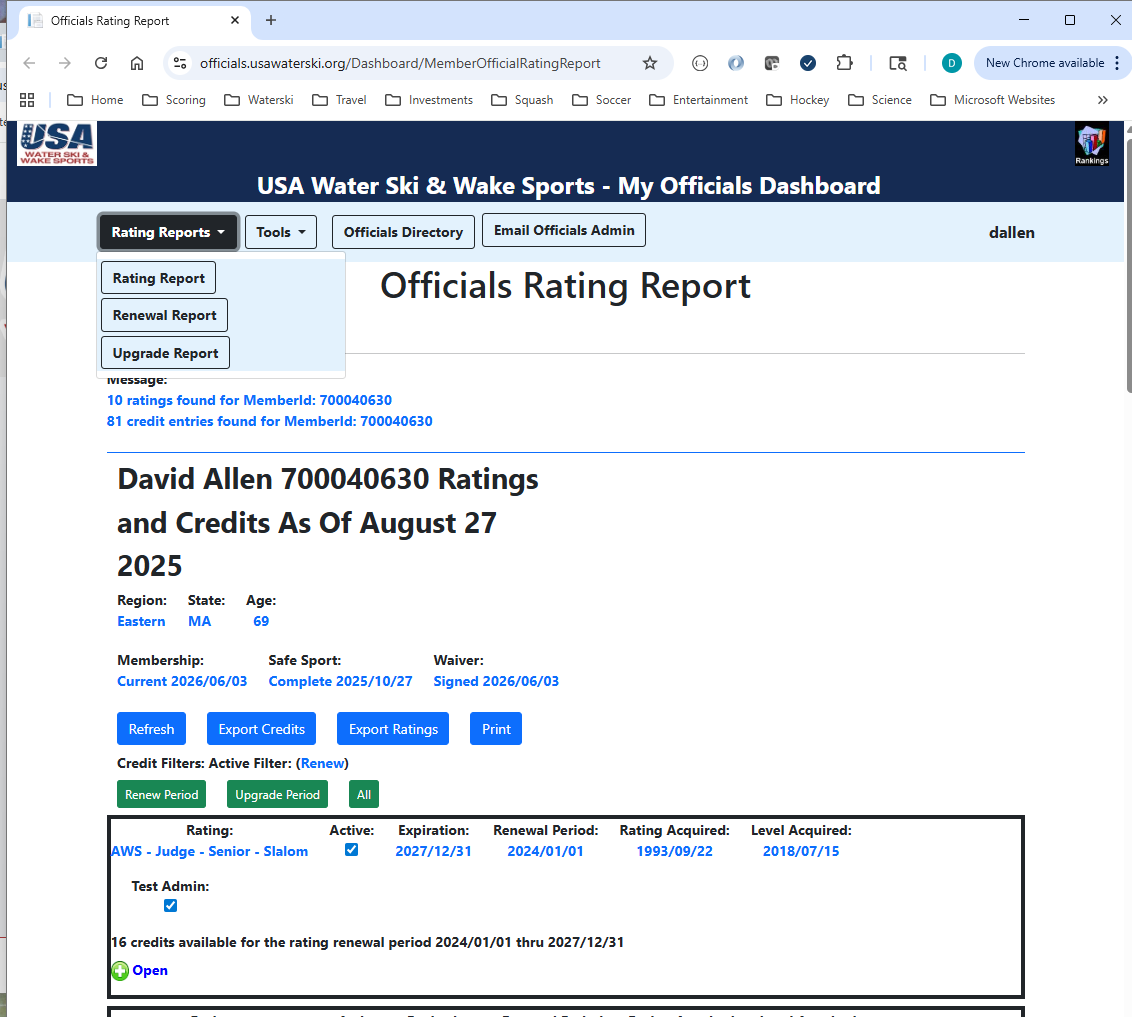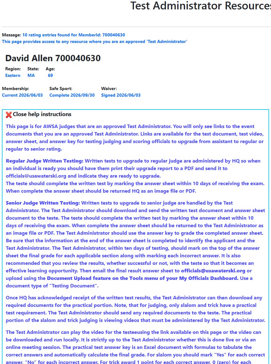 We’re excited to announce the launch of the new Officials Dashboard, now available directly through your USA Water Ski Membership Profile! Thanks to the work of Dave Allen and Melanie Hanson, this dashboard provides a centralized and convenient way to view and manage all your officials-related information. Here’s what you can do: